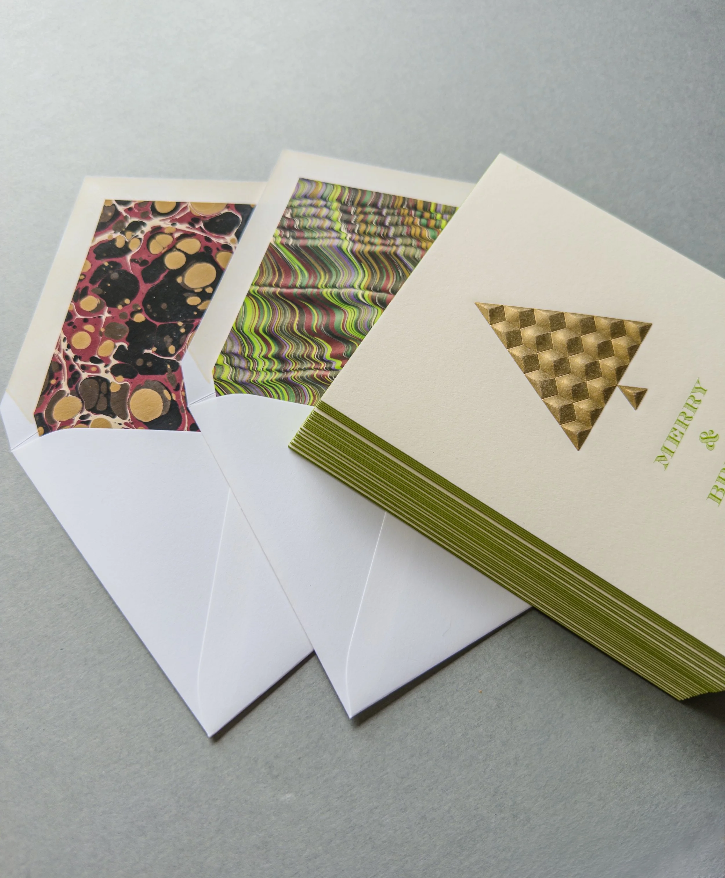 Letterpress is the reverse of engraving in function. The design is pressed into the paper, creating a debossed image. Although historically a deep impression was not desired, modern letterpress pushes the limits of the paper. Creating beautiful hills and valleys that compliment the design of every piece.