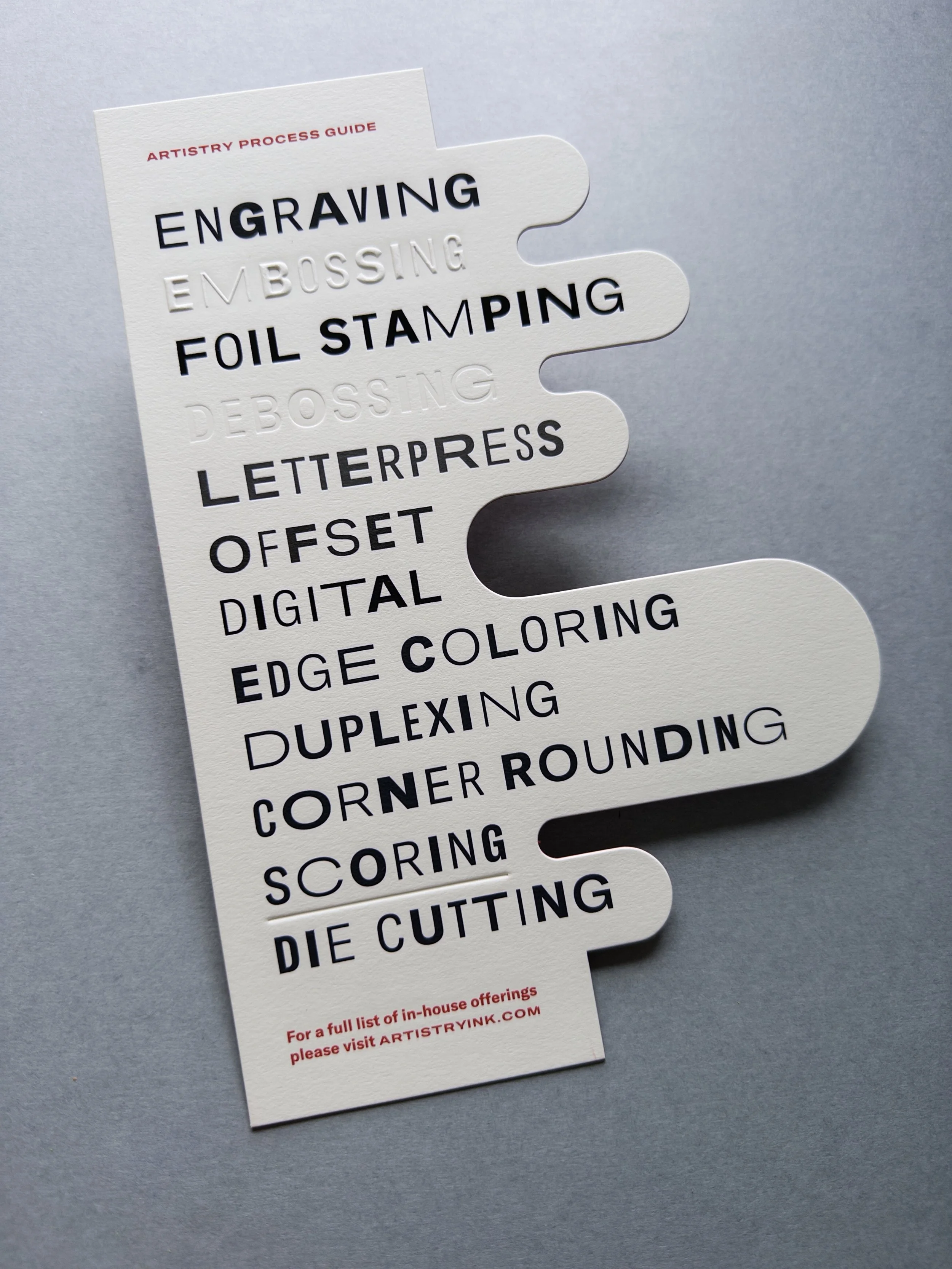 Foil Stamping is hot! Up to 300 degrees hot. Another debossing process, the heat is what makes the foil transfer, leaving behind the design in the chosen foil. It is an excellent process to use to cover large areas but also makes fine type shine. Our foil providers have many colors and finishes to choose from.